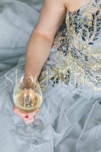 Vertical stock photo of a woman in a light blue dress with a glass of wine