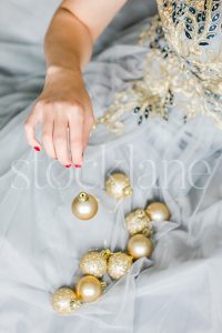 Vertical Stock photo of a woman in a white dress with a Christmas ornament