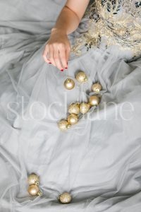 Vertical stock photo of a woman in a light blue dress with Christmas ornaments