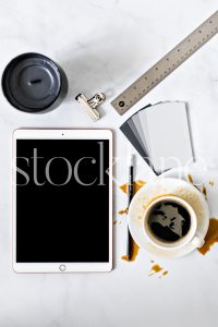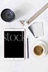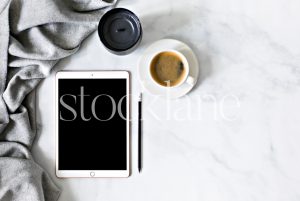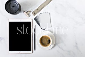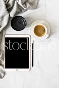 Vertical stock photo of a desktop with an iPad and a cup of coffee