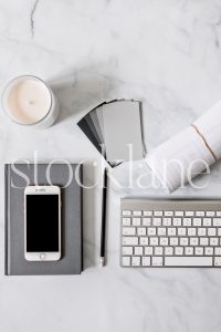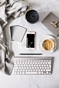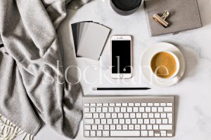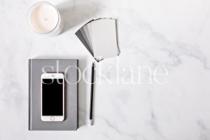 Horizontal stock photo of a desktop with an iPhone