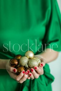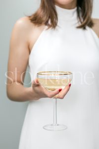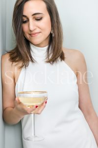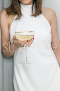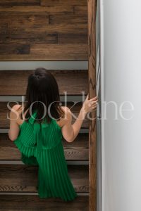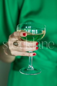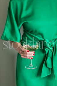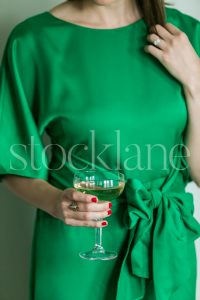 Vertical stock photo of a woman in a green dress sitting on stairs, holding a glass of champagne.