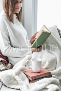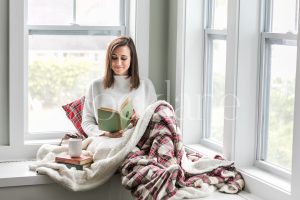 Horizontal holiday stock photo of woman reading a book.