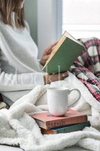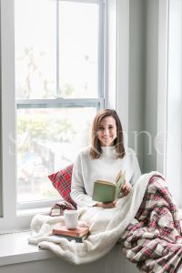 Vertical holiday stock photo of woman reading a book.
