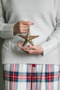 Vertical holiday stock photo of a woman holding a star ornament.