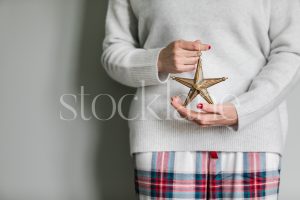 Horizontal holiday stock photo of a woman holding a star ornament.