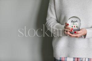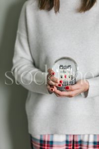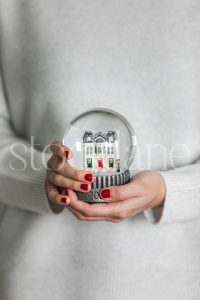 Vertical stock photo of a woman holding a holiday snow globe.