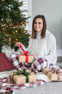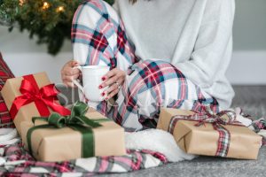 Horizontal stock photo of woman sitting next to Christmas presents.