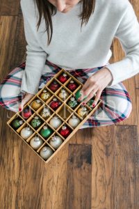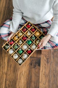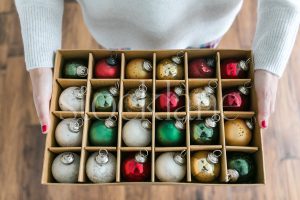 Horizontal stock photo of a woman holding a box of Christmas ornaments.