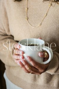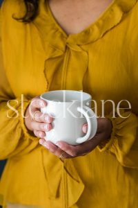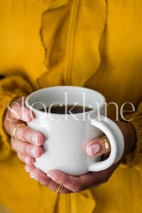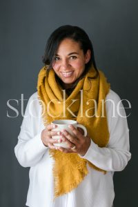 Vertical stock photo of a woman holding a coffee cup.