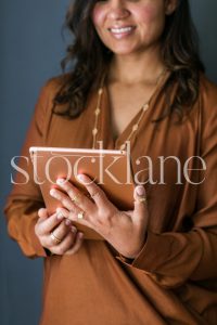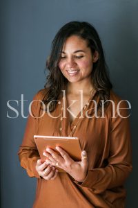 Vertical stock photo of woman holding an iPad.