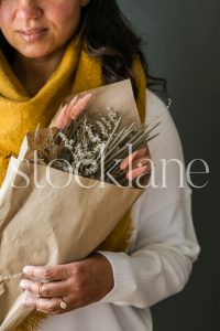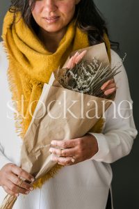 Vertical stock photo of a woman holding a dried fall bouquet.