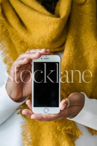 Vertical stock photo of a woman holding an iPhone.