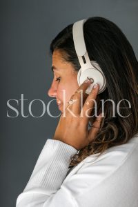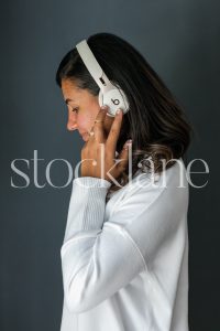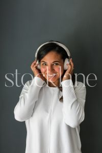 Vertical stock photo of woman with headphones.