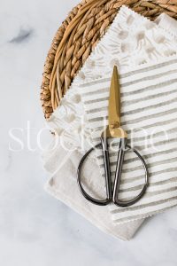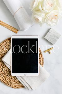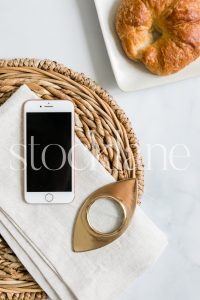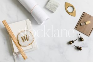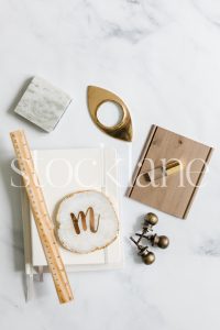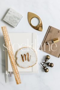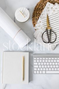 Horizontal stock photo of designer neutral desktop.