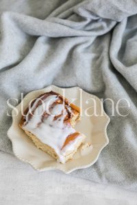 Vertical stock photo of a cinnamon roll on a gray blanket.