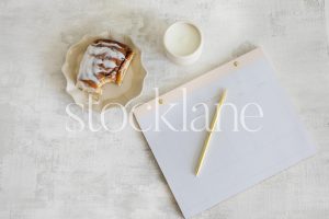 Horizontal stock photo of a white desktop and a cinnamon roll.