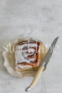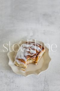 Vertical stock photo of a cinnamon roll on a vintage plate.