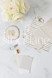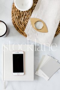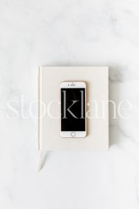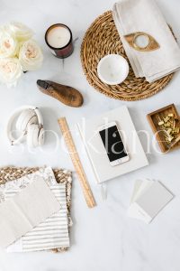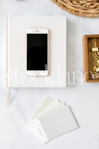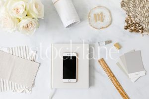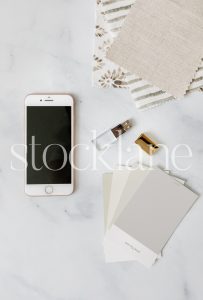 Vertical stock photo of a phone and designer fabric and paint samples.