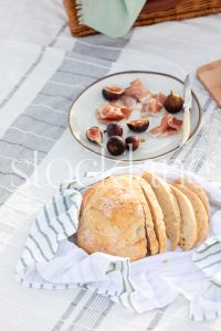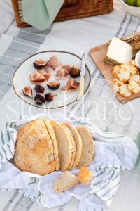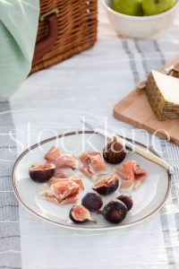 Vertical stock photo of plate with figs and prosciutto in beach picnic setting.