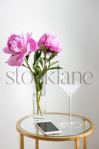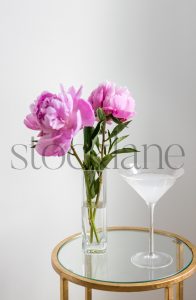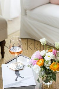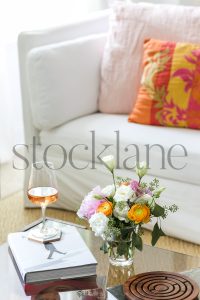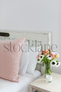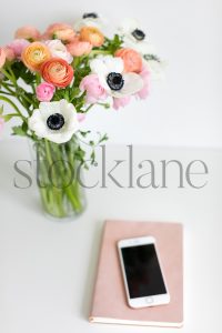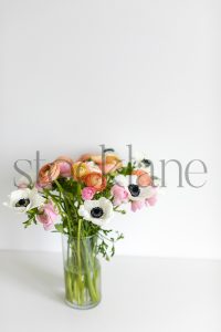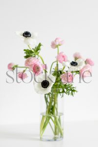 Vertical stock photo of spring flower arrangement with pink ranunculus and white anemone.