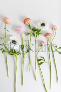 Vertical stock photo of white anemone and pink ranunculus flowers on a white background.