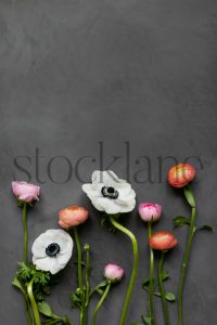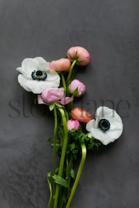 Vertical stock photo of white anemone and pink ranunculus flowers on a dark background.