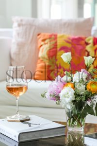 Vertical stock photo of a spring flower arrangement with white anemones and pink ranunculus.