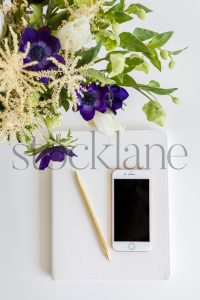 Vertical stock photo of feminine desktop with pink notebooks and spring flower arrangement.
