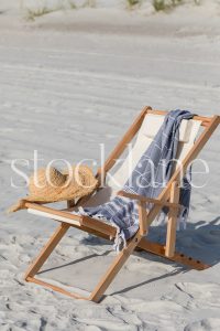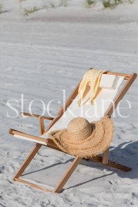 Vertical summer lifestyle stock photo of a white beach chair with a straw hat and a black turkish towel.