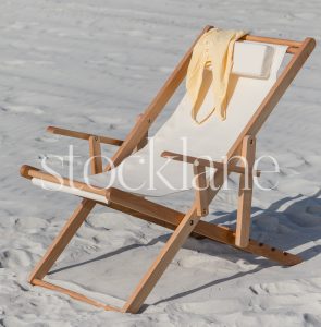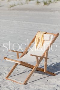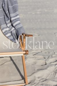 Vertical summer lifestyle stock photo of a white beach chair with a turkish black towel.