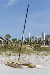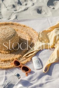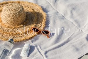 Horizontal summer lifestyle stock photo of a neutral beach towel with a straw hat and sunglasses.