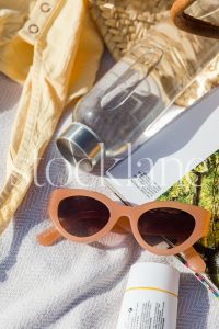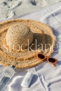 Vertical summer lifestyle stock photo of a neutral beach towel with a straw hat and sunglasses.