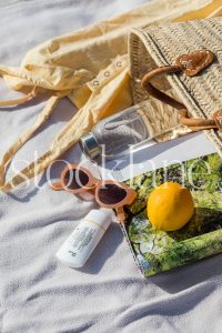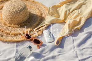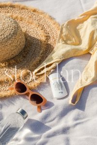 Horizontal summer lifestyle stock photo of a neutral beach towel with a straw hat, yellow swimsuit, sunglasses and water bottle.