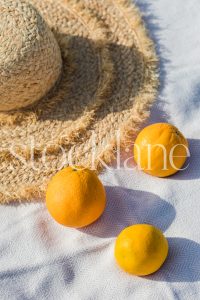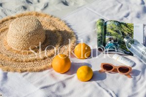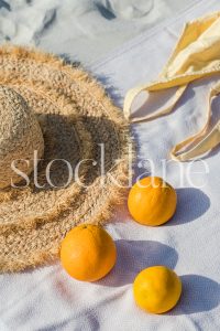 Vertical summer lifestyle stock photo of beach towel with a straw hat, a yellow swimsuit and oranges.