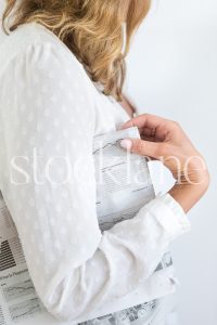 Vertical stock photo of a woman  holding a newspaper.