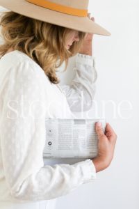 Vertical stock photo of a woman with a  neutral color hat holding a newspaper.