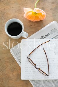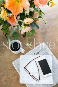Vertical stock photo of coffee, newspaper, and spring flowers.