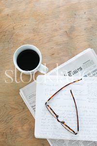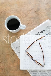 Vertical stock photo of coffee, newspaper and notes.