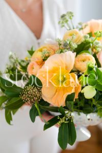 Vertical stock photo of woman holding spring flower arrangement.