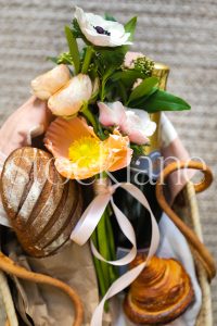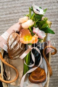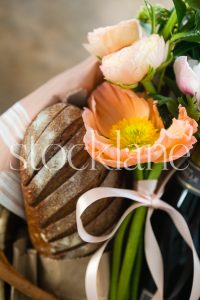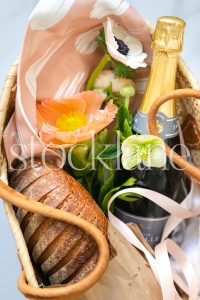 Vertical stock photo of picnic basket with bread and spring florals.