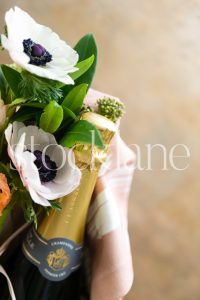 Vertical stock photo of picnic basket with champagne and spring florals.