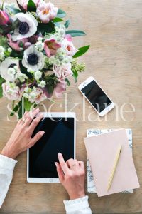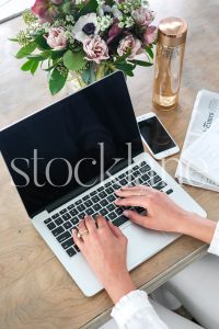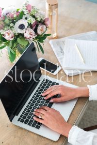 Vertical stock photo of woman sitting at a desk with laptop computer, phone and notes.