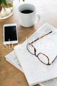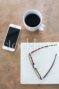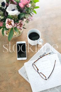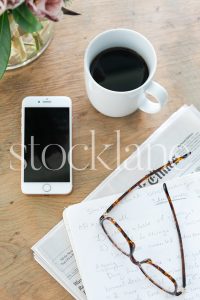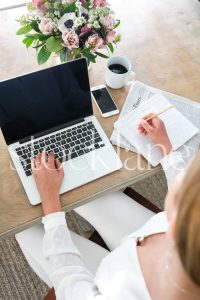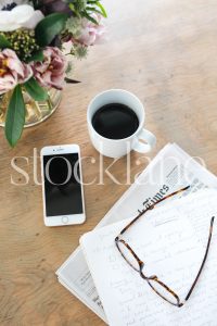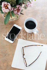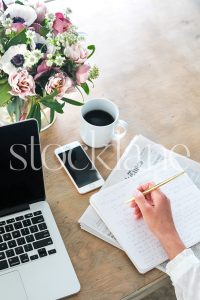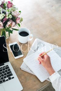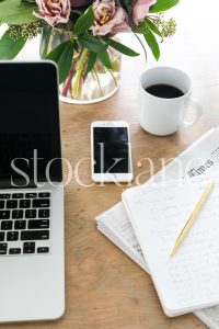 Vertical stock photo of woman sitting at a desk with laptop computer, coffee, phone and notes.