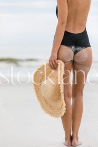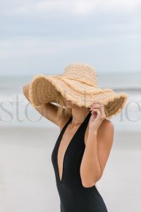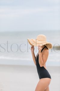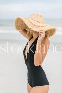 Vertical stock photo of woman at the beach in black bathing suit and big straw hat.