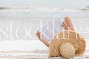 Horizontal stock photo of woman reading at the beach.