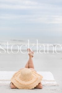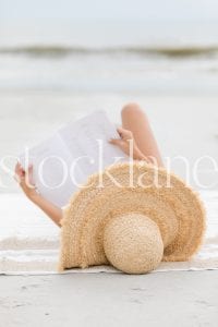 Vertical stock photo of woman reading at the beach.