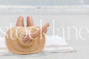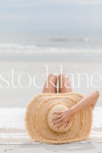 Vertical stock photo of woman at the beach holding her hat.