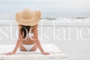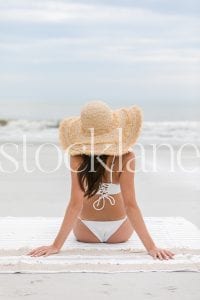 Horizontal stock photo of woman at the beach wearing white bikini.