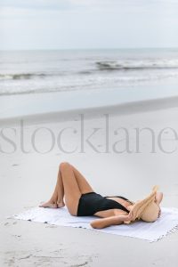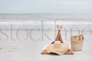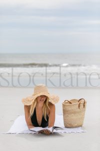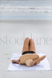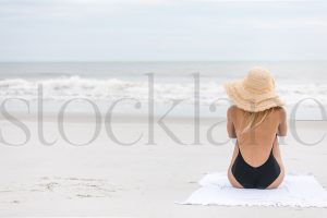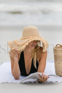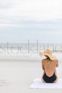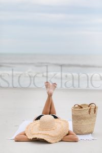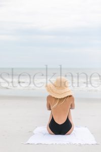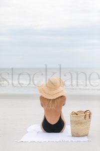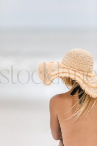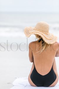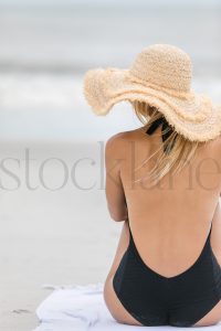 Horizontal  stock photo of woman at the beach in black bathing suit and big straw hat.